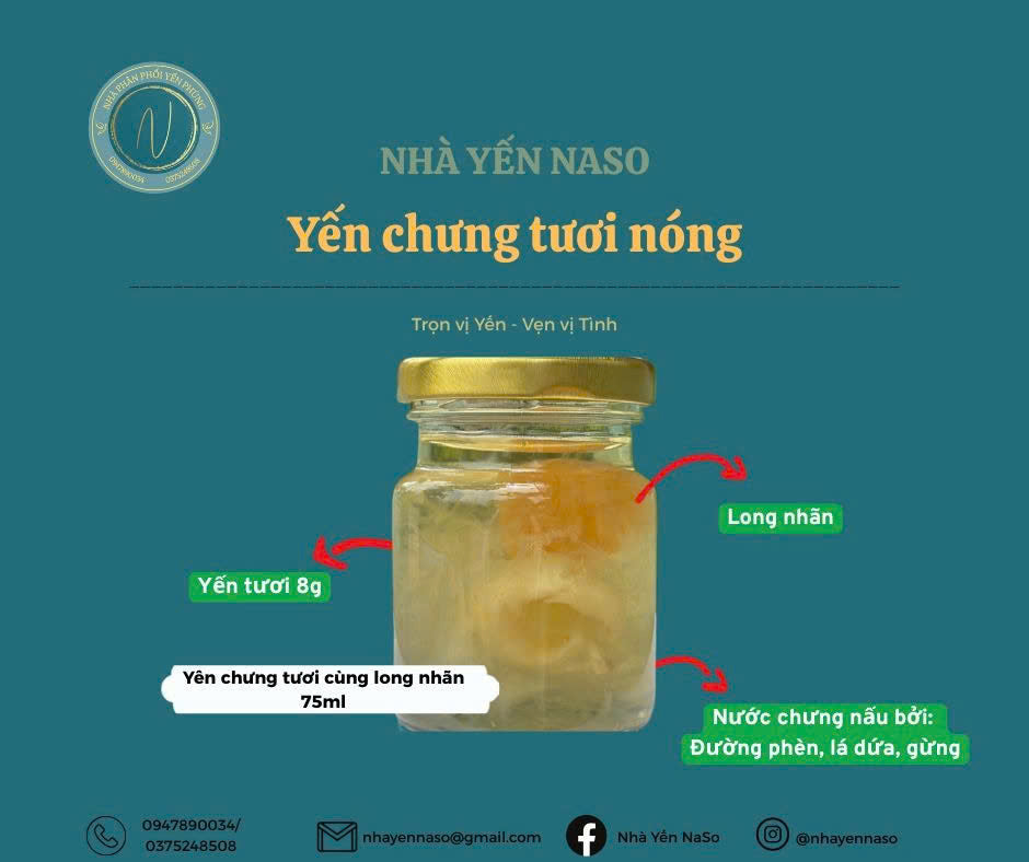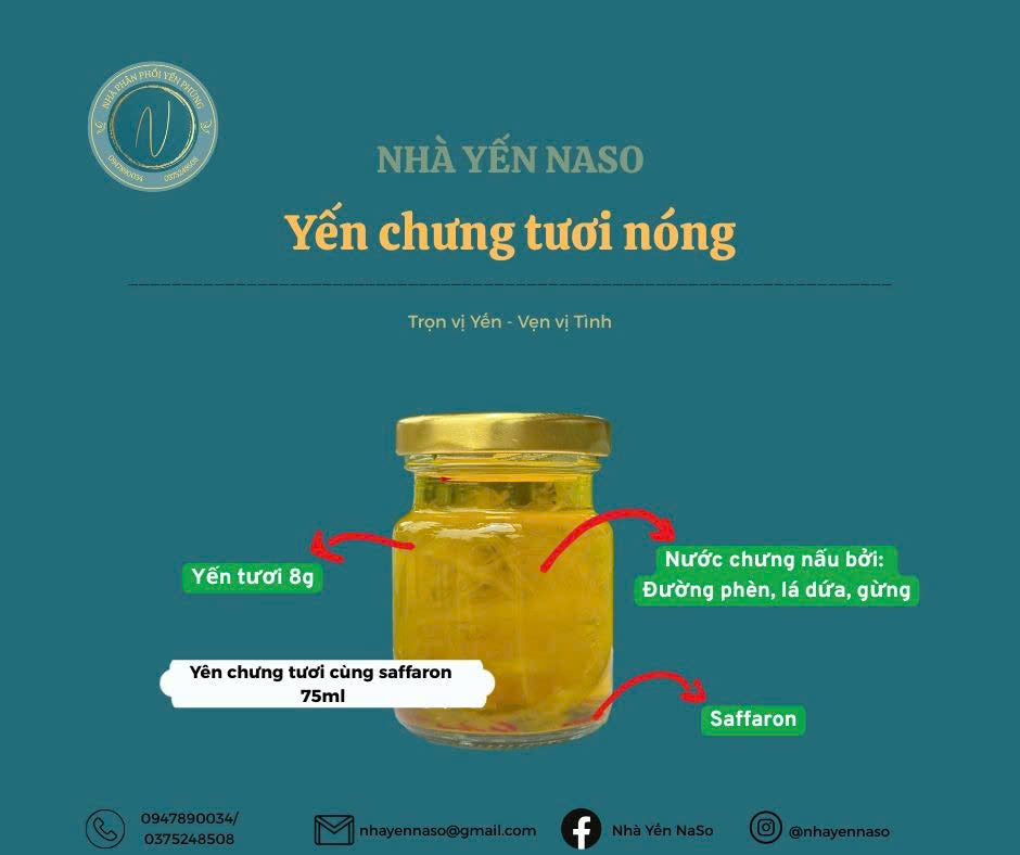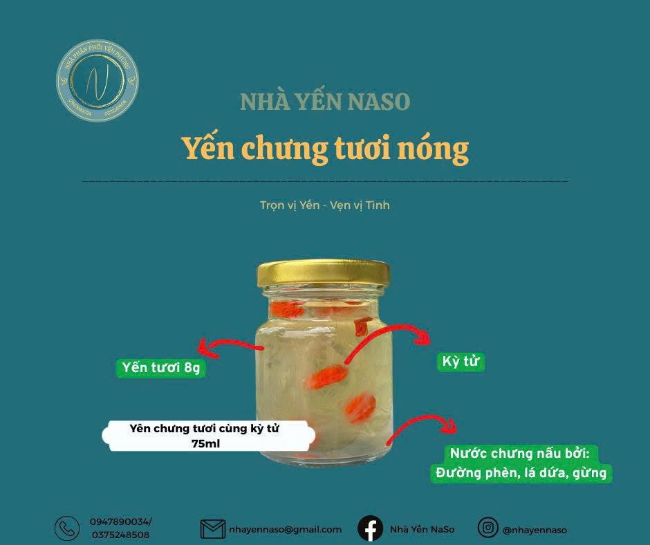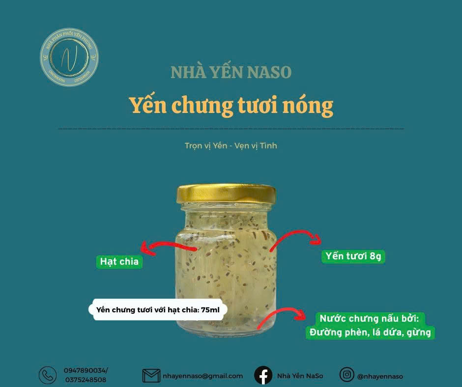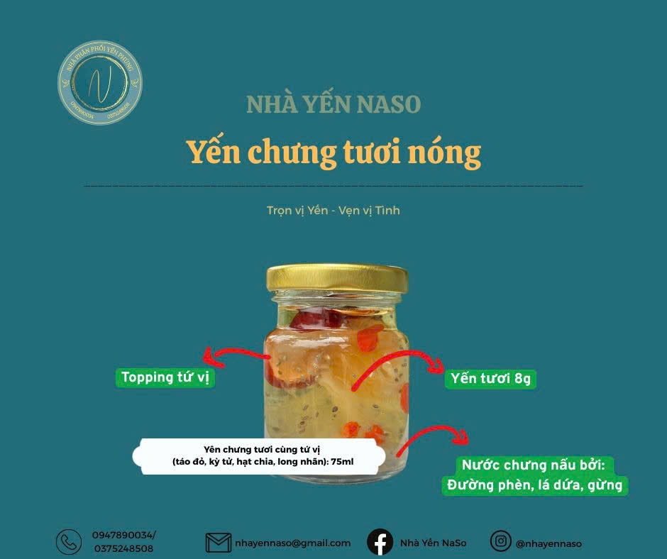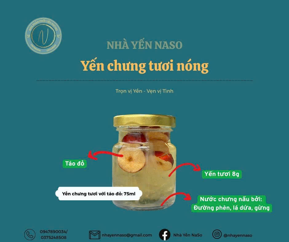 Yến chưng tươi nóng của Nhà Yến NaSo được làm từ tổ yến do nhà nuôi tự nhiên 100%. Chim yến trưởng thành được chọn lựa kỹ càng, cho ra sản phẩm yến sào chất lượng nhất, ngon nhất và bổ dưỡng nhất. Yến chưng tươi nóng được nấu bằng quy trình đảm bảo an toàn, nói không với chất bảo quản và phụ gia độc hại